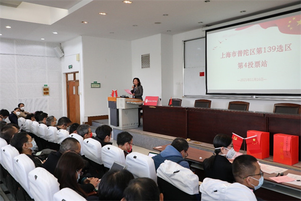 学院党委书记李恺主持普陀区第139选区第4投票站会议。投票站严格按照要求,悬挂国旗、会标,张贴书写投票选举的注意事项。在清点选民人数,通过总监票人、监票人、计票人名单后,工作人员依次分发选票、选民按照注意事项要求写票,并按照规定的路线投票,秩序井然。在全院教工的共同努力下,我院投票站选民参选率达100%,选票100%有效,最终选举结果将在普陀、闵行区选举办批复后正式公布。