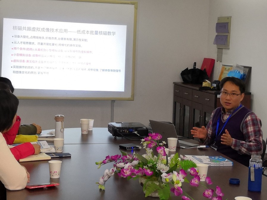 首先汪红志老师向各位老师介绍了虚拟影像成像原理仿真实验和波谱仿真实验的主要内容及其教学情况。接着郭平生老师和邓莉老师介绍了实验中心的虚拟仿真实验相关情况。