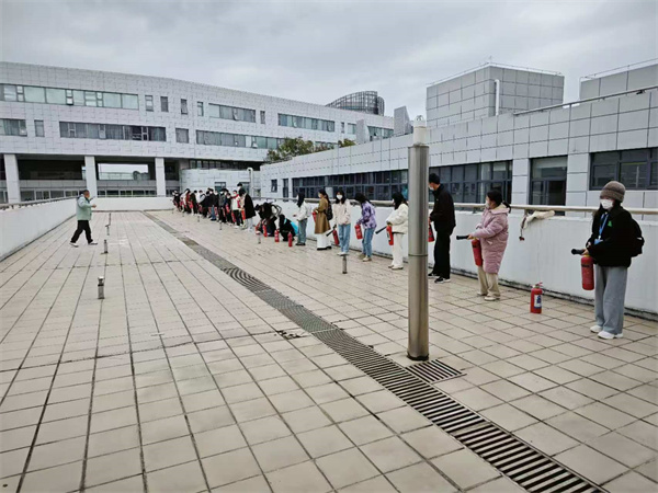 讲座结束后,参会师生在物理楼三楼平台开展灭火器实操演练。张燚现场指导灭火器的使用方法,师生依次进入操作区,进行实操演练。