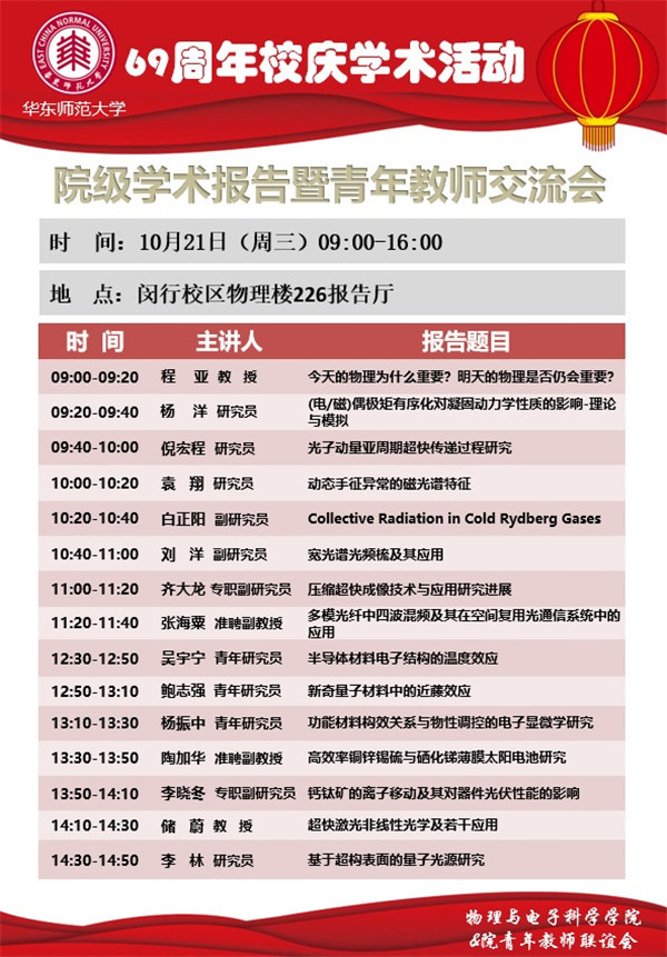 为进一步促进学术交流、活跃科研气氛,10月21日,学院在闵行校区物理楼226报告厅召开69周年校庆院级学术报告暨青年教师交流会,14名青年教师作院级学术报告,学院党政班子成员等近百名师生参会。
