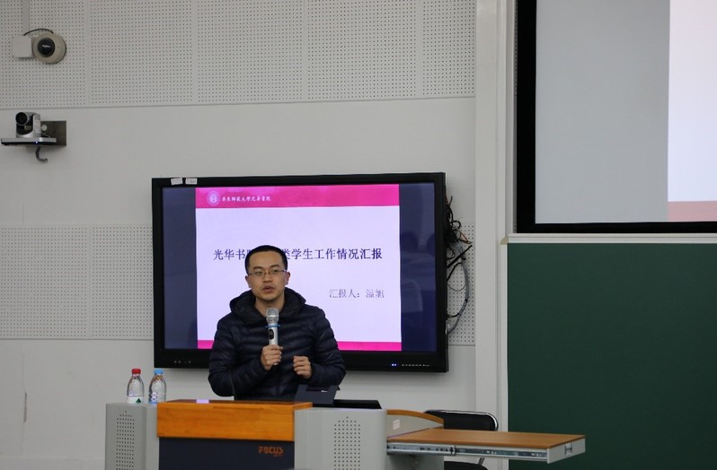 光华书院辅导员温旭应邀作物理类非师范生情况汇报。他首先围绕物理类非师范生的群体特征、党员发展情况等方面进行汇报,分析了2017、2018级物理类非师范生的学业情况、预警名单及帮扶措施。温旭同时介绍了书院在实践育人方面的推进情况,特别是物理类本科生参加活动类型的柱状图分析和对比分析。