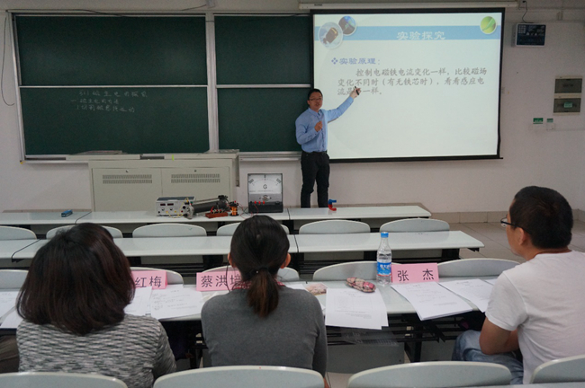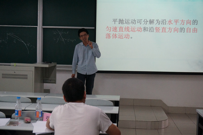 经过前期的激烈角逐,共有7名 选手脱颖而出进入到决赛。每位参赛选手自主选取中学物理一节课的内容,进行十分钟模拟课堂教学。比赛现场,参赛选手个个精神饱满,仪态大方得体,教学思路清晰,语言表述准确,教学内容充实,充分显示了我院研究生扎实的教学基本功。黄少峰同学讲课不仅幽默风趣,而且十分严谨,通过对运动特点细致的分析,逐步 引导学生加深对平抛运动的认知,进而结合简单易懂的实验得出平抛运动可分解为两个分运动的结论。教学过程环环相扣,循循善诱,为大家展现了中学教师的迷人风采,获得了评委们的一致好评,摘得了本次大赛的冠军。