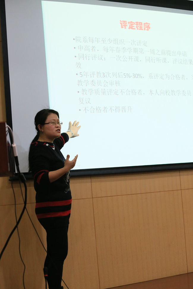 教学质量评估是教师们关注的焦点问题之一,系副主任王向晖全面、详细地为大家解读了新版的《华东师范大学本科生教学质量评估办法》,评估结 果将于职称评定挂钩。使在座老师们对学校教学质量评估的最新要求有了较充分和深刻的认识,也明确了今后工作中自身努力的方向。另外,王老师还介绍了本学期 本科生毕业论文开题报告、中期考核、提交、答辩,以及大学生科创、自主实验导师库上报等各个时间节点要求,提醒导师们加以重视。