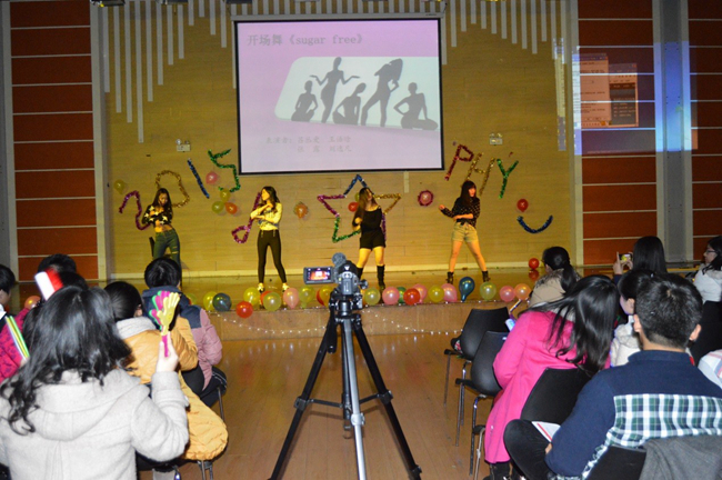 祝福视频播放完毕后便是火辣劲爆的开场舞sugar free,它点燃了全场观众的热情,在这热烈的氛围中“ Wu动梦想, Li赞青春”2015研究生元旦晚会的序幕缓缓拉开。台上演员卖力表演,台下观众也是掌声不断,叫好声连连。由李佳隆、聂啸宇两位同学表演的相声《十点钟 的太阳》可以说是整个晚会最大的亮点,让大家有幸在2014年末一睹理科男货真价实的相声范儿。由吕丛爱等同学带来交谊舞《爱的华尔兹》亦是引起全场另一 波高潮,女生优雅男生绅士,赏心悦目。欧湘慧等同学主演的小品《西游歪传》,金句多多,令人捧腹。其他的节目也是精彩连连,博得同学们掌声不断。此次晚会 除了精彩的节目表演之外,更有游戏环节、抽奖环节和微博墙互动,使得本次的元旦晚会愈加精彩。 持续将近两个小时的元旦晚会历经一个月的筹划和准备,期间演员们百分百的参与和投入,研究会工作人员无私付出,2014级研究生班委鼎力协助,院系领导老师更是大力支持。 12月27日,2015年物理系研究生元旦晚会终于在大家的笑声和掌声中圆满落幕!