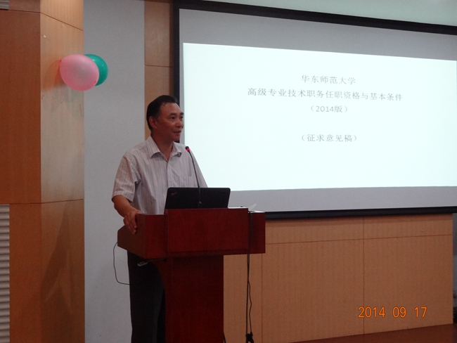 马老师首先为大家一一介绍了本学期新加入物理学系的青年教师,大家用热烈的掌声对几位青年才俊的加入表示欢迎。相信随着越来越多的优秀青年 人才的加入,物理学系将迎来一个新的快速发展阶段。接下来,马老师为大家传达了学校近期举行的综合改革会议的有关内容和精神,主要涉及到全面推进招生培养 工作,今年的毕业生就业形势,学科建设及重点实验室建设等内容,使与会教职工对我校当前的工作重点有了较明确的认识。职称评定是教师们比较关心的问题之 一,马老师为大家详细解读了最新的《华东师范大学高级专业技术任职资格与基本条件》征求意见稿,涵盖了各系列正高、副高等职称的最新任职条件和要求。