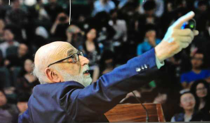 受聘仪式后,恩格勒以“布绕特-恩格勒-希格斯机制及其标量玻色子——用创造力超越我们眼见的世界”为题,为华东师大师生作了一次高端学术演讲,这位耄 耋之年的教授坚持站着面对济济一堂的师生讲述其一生学术研究的结晶,他充沛的激情、清晰的逻辑和严谨的科学精神,深深感染了在座的听众。