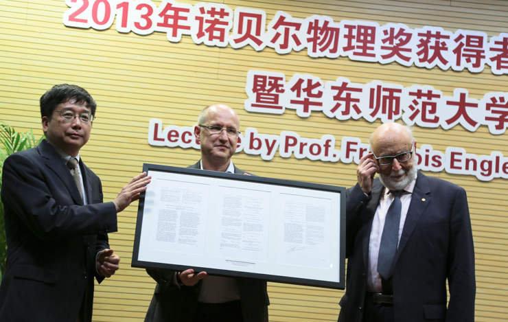 今天下午3点,“上帝粒子”的发现者、诺贝尔物理学奖获得者弗朗索瓦•恩格勒(Francois Englert)教授到访华东师大,从校长陈群手中接过了荣誉教授的证书。上午,弗朗索瓦•恩格勒在中山北路校区参观了我校精密光谱科学与技术国家重点实验室,并参加学术沙龙。他还接受了解放日报、文汇报、新民晚报、新闻晨报、青年报等多家媒体的专访。我校党委副书记兼副校长任友群主持媒体见面会。比利时布鲁塞尔自由大学副校长Jean-Michel DE WAELE教授一行陪同来访。