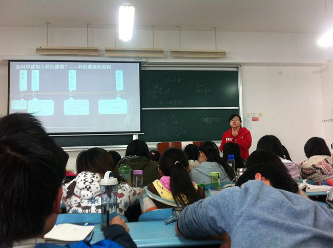 2014年3月26日下午,物理系团委书记黄蕊老师在第四教学楼423教室为13级物理学基地班和光电子班的同学上了一节以“物理人的科创路”为主题的学业指导课。