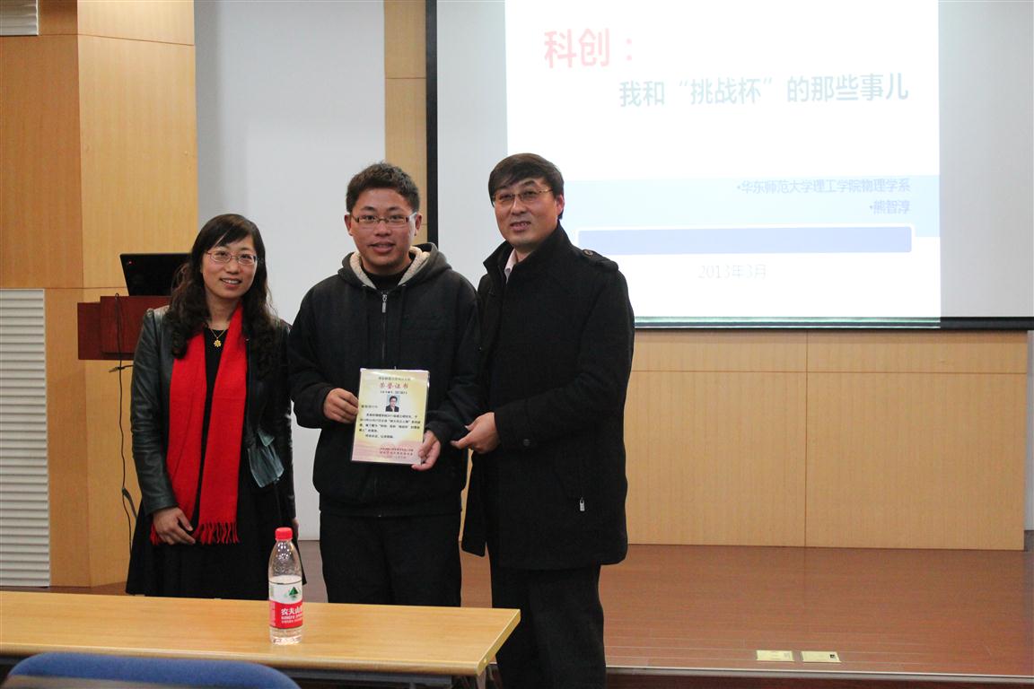 2013年3月27日下午13点,“师大风云人物”系列讲座——我和“挑战杯”的那些事,在物理楼226报告厅举行。校研究生院副院长兼研工部 部长刘敏老师、校研会主席唐婧琦莅临现场指导。物理系纳光电集成与先进装备教育部工程研究中心主任、终身教授、熊智淳同学的导师——孙卓老师作为点评嘉宾 出席了讲座,物理系党委副书记李燕老师主持了讲座。 熊智淳同学是物理系2011级硕士研究生,曾获十二届“挑战杯”全国大学生课外学术科技作品竞赛特等奖、第五届上海市青少年科技创新市长奖、2011年度 中国大学生年度人物入围奖、华东师范大学校长奖学金等奖项。