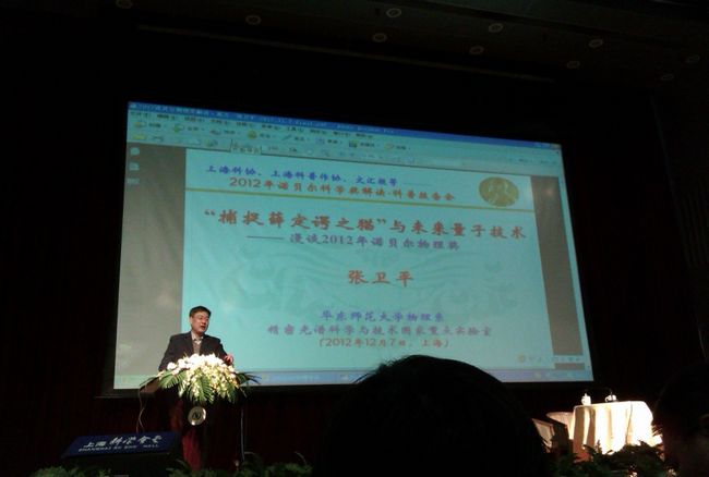 2012年诺贝尔物理奖授予了法国科学家赛尔日•阿罗什(Serge Haroche)与美国科学家大卫•维因兰德(David Wineland),因他们独立发展了“测量与操控单个量子系统的突破性实验方法”。为紧跟时代步伐,了解国际科学前沿发展,激发年轻一代的科学兴趣与探 索精神,上海市科协,联合上海市科普作家协会、《文汇报》、《科学》杂志、上海科技教育出版社、上海电影集团科教电影制片厂、《自然与科技》杂志、《上海 科坛》杂志、《上海科技报》等单位以及瑞典驻沪总领事馆,于2012年12月7号下午在上海市科学会堂主办了“解读2012年科学诺贝尔奖-物理奖”报告 会。报告会由上海市科协副主席、科普作家协会理事长褚君浩院士主持,我校国家重大科学研究计划首席科学家张卫平教授应邀作为主讲嘉宾作主题报 告。报告会在瑞典驻沪总领事馆领事Linda Backteman女士致辞、观看有关诺贝尔的生平短片后进入主题报告环节。张卫平教授以生动的语言、精美的图片、深入浅出,通俗易懂的方式向参会的社会 各界人士呈现了量子物理的精妙、2012年诺贝尔物理奖的科学内涵以及所引领的量子技术,包括量子通信、量子计算、量子钟、原子干涉仪、陀螺仪等。报告会 还安排了主讲嘉宾与邀请嘉宾的互动环节。美国普林斯顿大学历史学博士、复旦大学历史系吴以义教授,《文汇报》首席记者张懿先生作为邀请嘉宾与张卫平教授进行了现场互动。