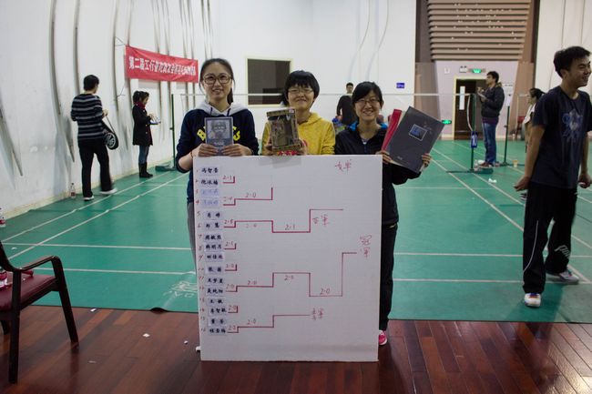 比赛从八点开始,首先进行的是女单和男单,最后是混双。各参赛者以积极参与体育活动的热情准时出席比赛,各裁判也是判罚公正、认真负责地记 录每一场比赛,有的举牌,有的记录,大家协调一致,而几位工作人员也是忙的不易乐乎,为羽毛球赛的顺利的进行提供了保障。赛场上,选手们挥汗如雨,使出全 力应对每一个球,最精彩的应属混双,一男一女配合默契,时而一前一后,时而一左一右,经过多轮激烈比赛后,大家都筋疲力尽,最终俞锎与聂纯阳分获男女单打 冠军,聂纯阳、黎晋良获得混双冠军。