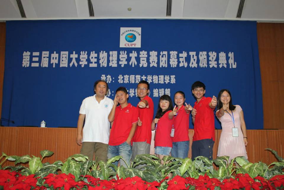 2012年8月18日-22日,第三届中国大学生物理学术竞赛在北京师范大学拉开帷幕。我校物理系通过将近一年的精心准备和初赛的层层选拔,选派出5名同学(樊准,李为东,唐永成,王莎莎,文利),由薛迅,钱静老师指导,黄蕊老师带队组成的华东师范大学代表队参加了此次比赛,经过三天和来自全国各高校共36支代表队的激烈角逐,最终获得二等奖。