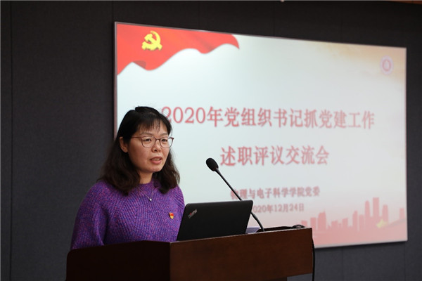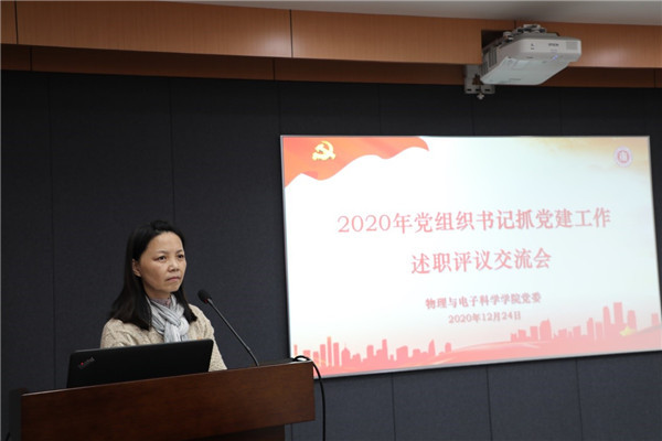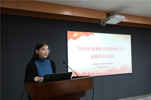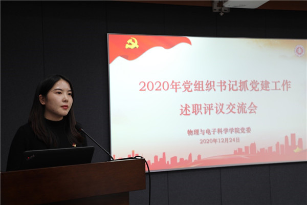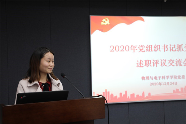 为切实提升党建引领成效,促进支部内涵建设,12月24日下午,学院党委在物理楼三楼多功能厅召开2020年度党组织书记抓党建工作述职交流会,学院党委委员、师生党支部书记、辅导员参会,会议由学院党委书记李恺主持,学院党委委员、师生党支部书记通过书面报告和现场述职相结合的方式,总结2020年度党建工作,交流心得体会。