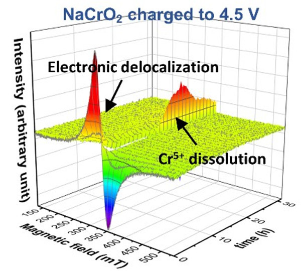 NaCrO2 因其低成本、高安全性和高功率的特点,成为钠离子电池正极的备选材料之一。在投入实际应用前,有必要进一步理解其在循环过程中的电子结构和相变特性。本研究中,采用原位EPR对NaCrO2在2.2-3.6V和2.2-4.5V电压条件之间循环切换时电子结构的演变进行监测。研究发现,在充电初期NaCrO2脱钠以后产生了电子离域效应,这或许是其具备卓越倍率性能的原因(图1)。