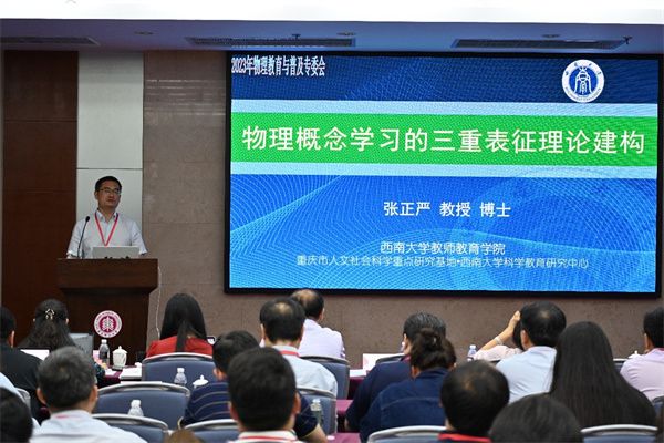物理教育与普及专业委员会主任(以下简称“专委会”)、西南大学科学教育研究中心主任廖伯琴,学校教务处处长周先荣,物理与电子科学学院院长、精密光谱科学与技术国家重点实验室主任程亚,高等物理教育研究会名誉理事长、我校物理系教授胡炳元等出席,会议由安博网页版副院长徐敏主持,周先荣、程亚与廖伯琴先后致辞。