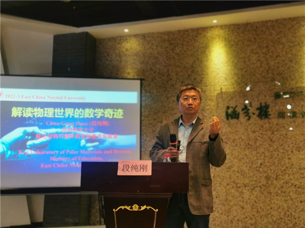 3月17日下午,物理与电子科学学院“师生共读”沙龙在闵行校区涵芬楼举行。学院常务副院长、极化材料与器件教育部重点实验室主任段纯刚教授应邀作为导读人,与同学们共读《物理世界的数学奇迹》。沙龙由学院团委书记王元力主持,学院党委副书记蒋旭,学院院长助理、极化材料与器件教育部重点实验室副主任越方禹参加活动。