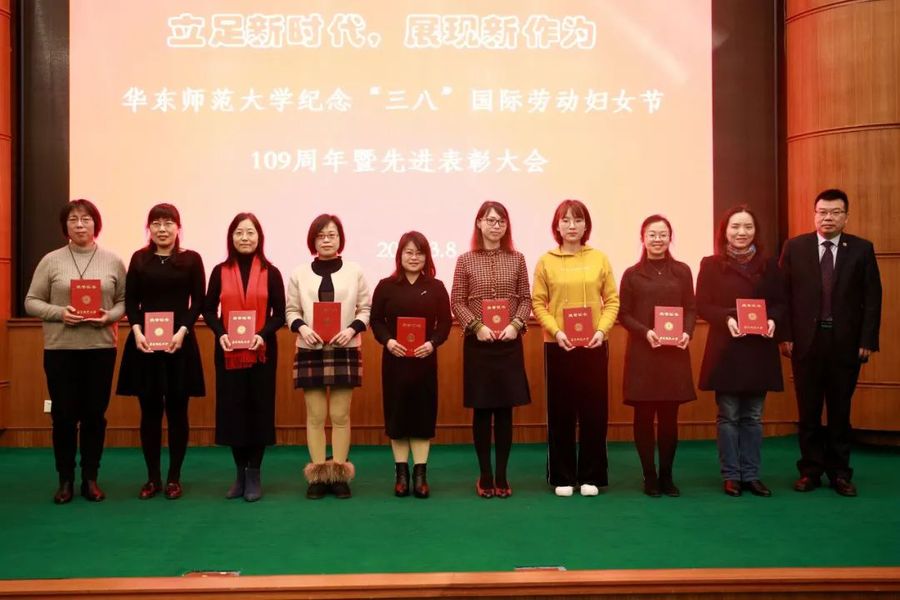 2019年3月8日上午,纪念“三八“国际劳动妇女节暨先进表彰大会在中山北路校区隆重召开。华东师范大学校长钱旭红、副校长孙真荣、副校长梅兵出席会议,并为获奖个人和集体颁奖。我院程亚院长获校“心系女职工好领导”荣誉称号;大学物理教学团队获校“三八红旗集体”荣誉称号。