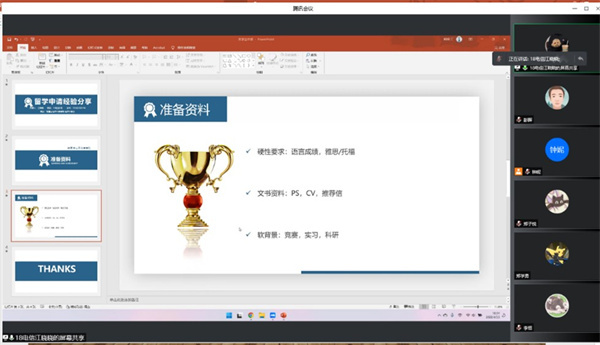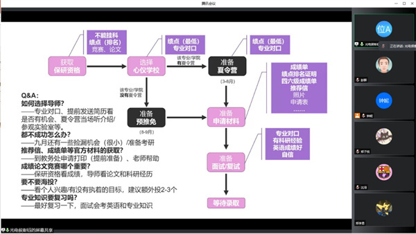 沈浔同学分享了自己考研的心路历程和选择调剂院校的经验,江晓晓同学介绍了申请境外高校研究生需要准备的各种资料和申请时间节点等信息。