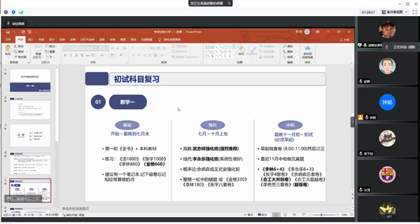 徐雪柯同学从保研学校的选择、导师联系、面试准备等方面进行了分享;贾其申同学结合自身经历谈到,一定要有计划、有思考地备战考研,根据自身实力和兴趣来选择考研学校和方向;胡黎同学从备考实战出发,详细地介绍了考研复习资料的选择及各种备考app的应用。