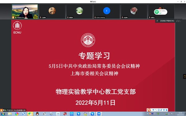 根据校党委组织部和学院党委相关要求,自5月8日起,各基层党支部纷纷开展支部研学,物理学系教工党支部、物理实验中心教工党支部、精密光谱国重实验室教工第一党支部、精密光谱国重实验室教工第二党支部、2020级研究生第二党支部、2020级研究生第一党支部、精密光谱国重实验室2021级研究生第一党支部、精密光谱国重实验室2020级研究生党支部等师生党支部分别开展多种形式的线上学习交流。物理学系教工党支部就学校疫情防控情况以及在线教学情况进行了交流讨论;精密光谱国重实验室教工第一党支部邀请留守校园抗疫和居家抗疫的党员同志结合会议精神,分享抗疫故事和感悟。