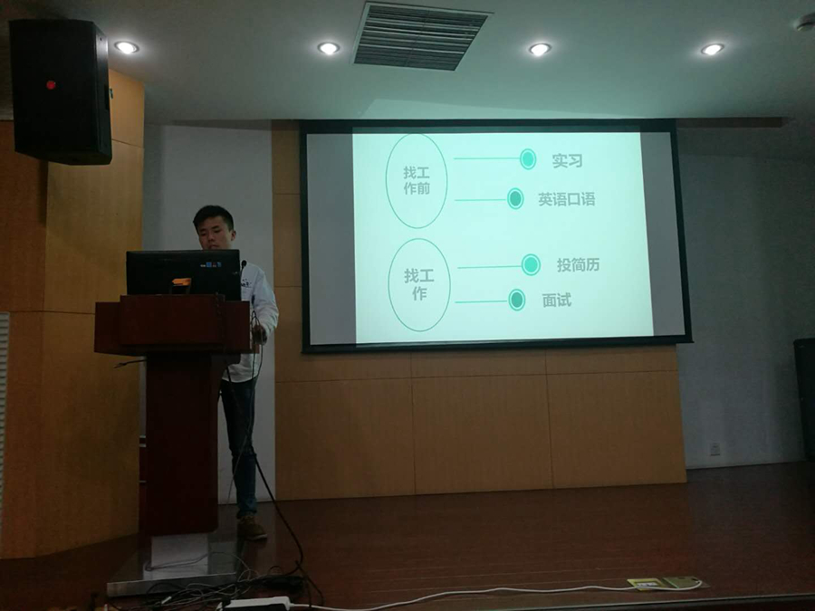 签约公司的韩海平,为大家详细介绍了自己从投简历到签约的整个经历,以及其中的困难和收获,他认为工作中最重要的就是要摆正自己的态度,忠于自己内心真正的选择。其次,从找工作前和找工作期间进行了一些介绍,结合自己在外企的就业经历、面试技巧等方面进行了经验分享。工作前一定要实习,如果到外企工作,一定要把英语口语练好,这样才可以更好的与顾客交流。在找工作期间,面试的过程中一定要结合自己的长处,给自己找到一个合理的角色进行定位。把需要做的事认真做了,在以后的工作中一定会发挥自己的重要作用。
