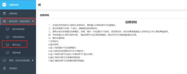 (2)登录后在左侧导航栏“教学科研、专职科研招聘职位”中的“青年论坛”模块进行在线简历填写及报名。