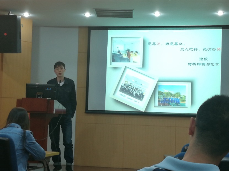 随后,来自材料物理与化学专业的徐俊师兄介绍了公司实习和求职经历,他已成功签约科勒公司。介绍了在几家公司实习的体验和收获,指出要充分利用好暑假和周末的时间,处理好科研与实习的关系。结合自己的经历对求职面试进行细致的讲解,比如:如何回答好面试的问题,如何在面试中展现最优秀的自己等。他告诫我们在选择时不要随波逐流,能够按自己的实际情况深思熟虑,慎重选择,但也不要畏手畏脚,要大胆向前,及早的做好准备,着重了解自己要求职的公司,知己知彼,百战不殆。