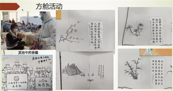 张楷乐谈到,本轮疫情来势凶猛,由于奥密克戎病毒的高传染性,医护感染风险加大,面对未知的恐惧,以及对方舱环境、医患关系的顾虑,医护人员无论从体力还是心理上都面临着极大的挑战。医疗队党员冲锋在前、主动扛责,组建方舱临时党支部、团支部,做好组织动员工作,不断摸索、反思、总结经验。为丰富舱内生活,医疗队党员们在做好医疗保障的同时,充分发挥科室特长,在舱内开展个性化医疗服务,如中医针灸,赠送中药香囊,带练五禽戏、八段锦等健身操。同时,还在方舱一角开设了“西岸学堂”,保障舱内中小学生的学习生活。方舱简陋的墙面上,医疗队的党员和团员用自己的书画作品做装饰,丰富精神生活,鼓舞抗疫斗志。
