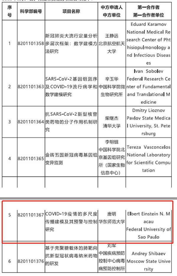 据悉,为应对新冠肺炎疫情,2020年金砖国家科技和创新框架计划在冠状病毒研究领域联合支持金砖五国科学家携手开展科研合作与攻关,包括国家自然科学基金委员会(NSFC)在内的各国资助机构负责资助本国科学家开展合作研究,本次全国共获批6项。