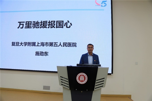 施劲东首先介绍了自己参加“非典”“H7N9禽流感”等国内疫情防控工作的经历,在2020年年初新冠疫情爆发时,施劲东提前终止意大利进修学习,义无反馈回国参加抗疫,带队奔赴武汉雷神山医院,加入抗疫一线。施劲东在雷神山医院克服种种困难和危险,在救治大量危重患者的同时,确保所有队员平安归来。在报告中,施劲东多次谈到“共产党员的责任和担当”,传递出了抗疫一线共产党员战无不胜、众志成城的精神。他说“每当看到国旗和党旗在身边飘扬,心中就充满了激情和勇气”。
