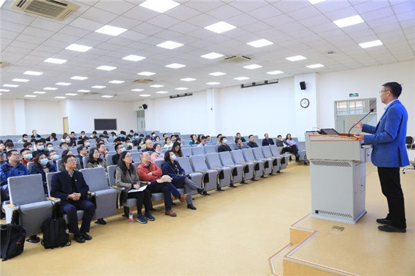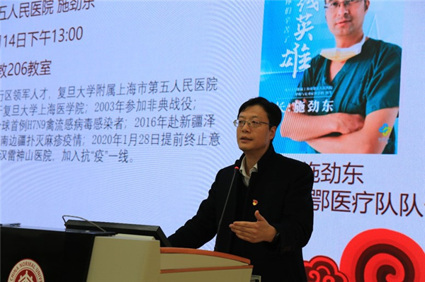 4月14日下午,由物理与电子科学学院党委主办,电子科学系教工党支部承办的“同上一堂抗疫思政课”党史学习教育主题报告会在闵行校区一教206教室举行,上海市闵行区援鄂医疗队队长施劲东应邀作题为“万里驰援报国心”的专题辅导报告。电子科学系全体教师、学生代表共80余人参加了本次报告会,报告会由电子科学系教工党支部书记黄荣主持。