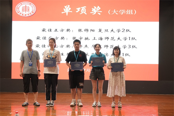 7月14日下午,大赛闭幕式在闵行校区大学生活动中心举行。上海科学院院长、上海教委原副主任孙真荣教授,上海市物理学会副理事长,复旦大学原副校长陆昉教授;教育部大学物理课程教学指导委员会副主任、上海市物理学会大学生物理竞赛委员会主任上海交通大学胡其图教授;华东师范大学教务处处长周先荣教授;上海市物理学会原秘书长、上海交通大学高景教授;上海市物理学会常务副秘书长,复旦大学徐建军教授;上海市教育学会物理教学专业委员会主任陆伯鸿教授;中国物理学会教育委员会副主任、上海市物理学会大学物理竞赛委员会副主任、复旦大学马世红教授;上海市教师教育学院特级教师、正高级教师、物理教研员汤清修老师等出席闭幕式并为获奖代表队颁奖。