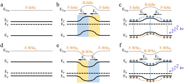 基于光激励KPFM的结果,研究者结合能带理论进一步阐明了弯曲InSe和WSe2中由挠曲电极化引起的方向相反的背靠背内建电场。同时给出了弯曲n型和p型半导体的能带弯曲模型和光生载流子捕获机制。