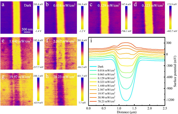 通过原位的光激励KPFM测试系统,研究者进一步观察到弯曲沟道中挠曲电极化与光生载流子的耦合效应。随着光注入的增强,弯曲半导体沟道中由挠曲电极化导致的势阱逐渐被光生载流子填充,表明其内部的内建电场逐渐被光生载流子的重新分配所补偿。实验结果证明了弯曲二维半导体中存在背靠背的内建电场,在InSe和WSe2中分别形成势阱和势垒,从而分别实现对电子和空穴的捕获。在光注入移除后,捕获的光生载流子缓慢释放,进而造成持续的光电流。
