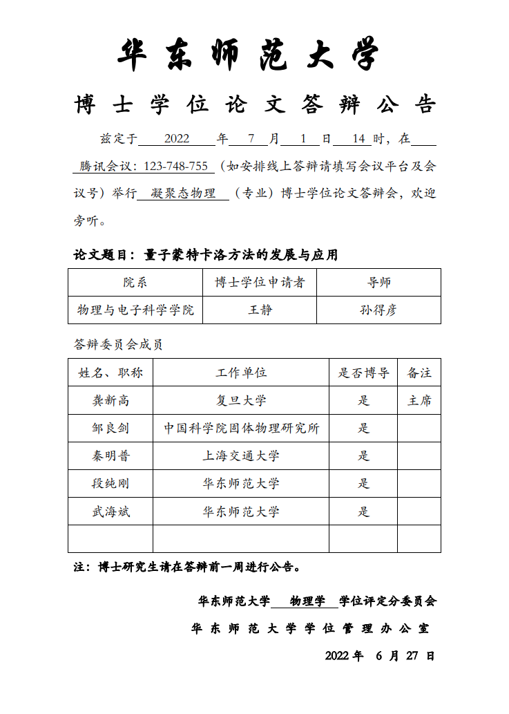 华东师范大学 博士学位论文答辩公告-王静