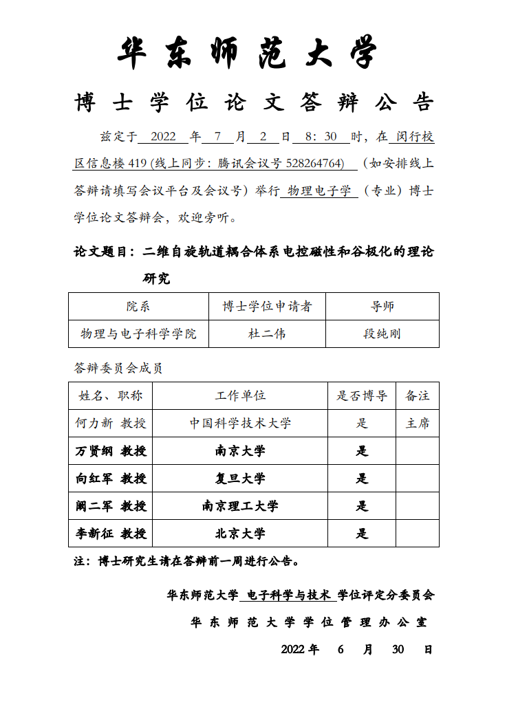 华东师范大学 博士学位论文答辩公告-杜二伟