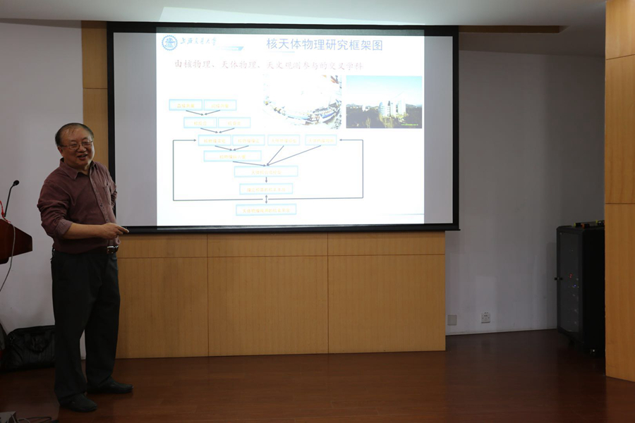 孙扬教授长期从事低能原子核物理和多体系统的理论研究,研究方向涉及到核结构理论、核天体物理、强关联多体物理、以及计算物理等诸多领域。回国后主要致力于我国核天体物理教学研究及其前沿发展的推动。报告的第二部分,孙扬教授就核天体物理的研究内容及研究框架进行了介绍并对同学们提出了殷切的期望。
