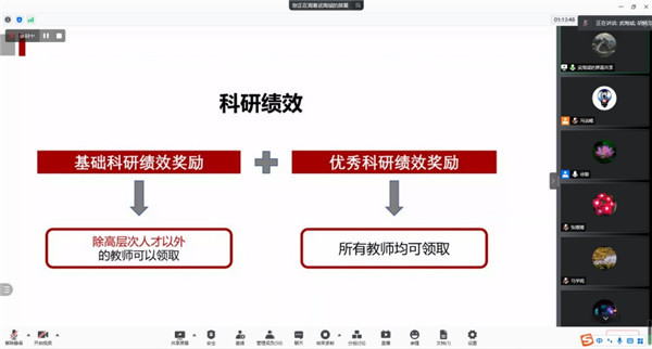 随后,学院党委书记李恺向与会代表介绍了学校2021年绩效奖励方案的主要精神、具体内容及学院绩效方案制定工作的推进情况。学院副院长徐敏、胡炳文、武海斌,学院党委副书记蒋旭分别就学院2021年绩效实施方案(审议稿)中的本科人才培养绩效、研究生人才培养绩效、科研绩效、管理与教学科研服务绩效等部分的修订原则进行介绍,重点说明了修改内容。