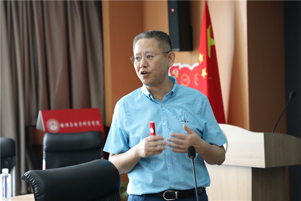 我院教师代表管曙光教授作题为“物理学创新人才培养模式探索”报告。他介绍了学院目前构建的可强化数理基础、突出创新能力、体现光物理特色的课程结构体系及课程建构,并简要汇报了学院近年在教学、人才培养上取得的代表性成果。他谈到,“教育不是灌输,而是点燃火焰”,目前学院教学体系强调前沿导向、思维导向、自主学习导向、创新导向,旨在培养学生科创融合创新能力,希望借此机会,和各位专家学习探讨教学发展建设。