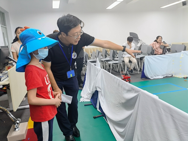 在赛事举办过程中,根据疫情防控需要,学院党委暂停了“追光”亲子科普活动,但仍有少数校内教师等携“小科技迷”慕名而来,“追光”党员先锋服务队在电子科学系教工党支部书记黄荣、学院专职组织员赵荣青的带领和对接下,一对一为小朋友开展科普讲解。