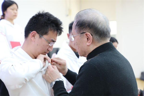 为勉励学院“追光”大学生科普宣讲团师生继续立足学科优势、弘扬科学家精神、助力乡村振兴,讲座结束后,褚院士为宣讲团志愿者颁发证书并佩戴徽章。
