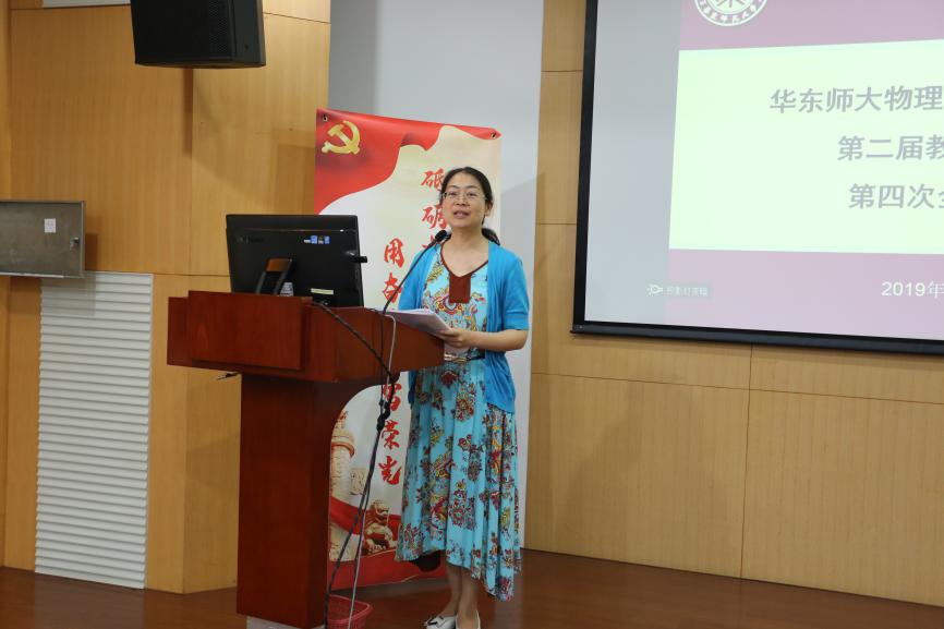 2019年7月2日9:00华东师范大学物理与材料科学学院第二届教职工代表第四次全体会议于闵行校区物理楼226报告厅顺利召开。本次会议主要议题为审议《华东师范大学物理与材料科学学院绩效2.0奖励实施办法(试行)-审议稿》,会议由物理与材料科学学院工会主席徐敏老师主持,物理与材料科学学院党委书记李恺及学院党政班子成员等共计26位学院教代会正式代表参加了会议。经讨论审议,与会正式代表投票表决,全票通过《华东师范大学物理与材料科学学院绩效2.0奖励实施办法(试行)-审议稿》。