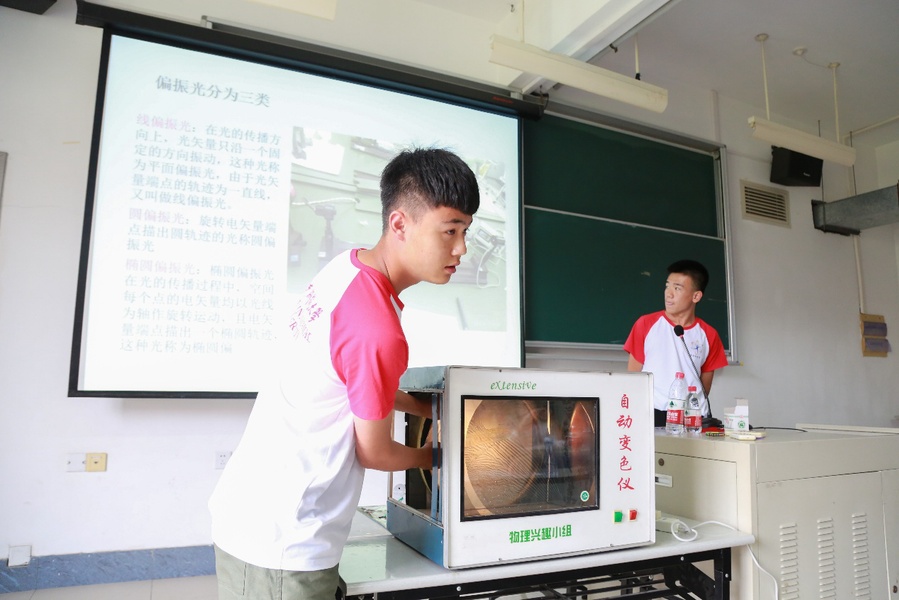 11日下午,成果汇报会为各位营员提供了展示风采的舞台,他们通过实物展示、多媒体演示、板书讲解等各种形式,将这两天在实验中心的所思所想、所做所得介绍给了其他营员。会上物理与电子科学学院物理学系主任、物理实验教学中心主任赵振杰教授、物理学系副主任柴志方副教授和物理学系副主任李欣副教授为他们的成果做了详尽点评,并遴选出优秀营员。