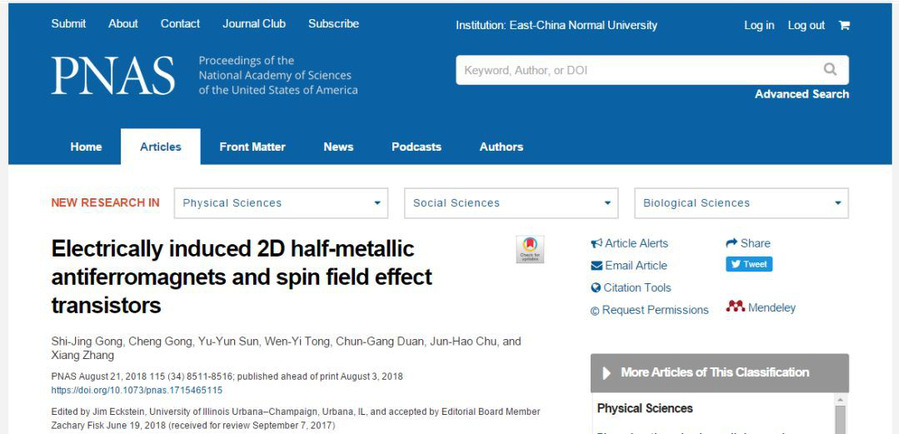 该研究以“Electrically induced 2D half-metallic antiferromagnets and spin field effect transistors”为题发表在《美国科学院院报》(PNAS)。这项研究与加州大学伯克利分校Xiang Zhang院士(现香港大学校长)合作完成,华东师范大学为第一完成单位,龚士静副研究员为第一作者,Xiang Zhang 院士为共同通讯作者。