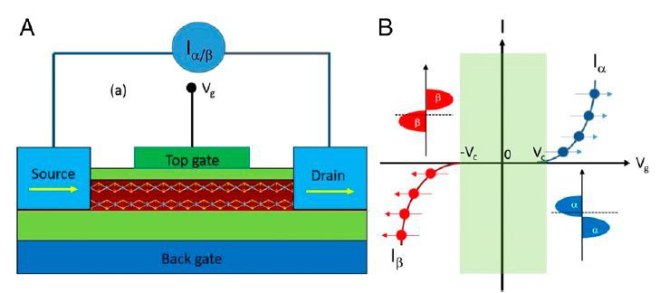该研究的重要意义在于,利用双层A-type反铁磁的half-metallicity性质可以实现新型的自旋场效应晶体管。当垂直电场大于临界电场时,即可获得100%的上自旋极化流(蓝色),翻转外加电场方向可获得100%下自旋极化流(红色)。1990年Datta提出的自旋场效应晶体管,其工作性能依赖通道中电子自旋进动的精准控制,该理论虽然备受关注但精准控制自旋进动状态在实验上困难重重。