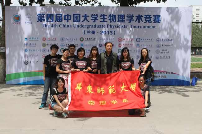 第四届中国大学生物理学术竞赛于2013年8月12日-16日在兰州大学拉开帷幕。我校物理学系选派出余登炯,宋圆圆,陈兰兰,胡雅健,陈晓芳 5名同学,由薛迅,杨继峰,钱静老师指导,黄蕊老师带队组成的代表队,利用暑假完善理论过程,改进实验方案,于8月11日赴兰州大学参加全国比赛,与来自全国各高校共39支代表队经历了三天的激烈角逐,荣获三等奖。