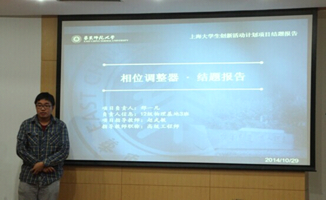 2014年10月,物理学系共有6组项目(包括由邢一凡同学负责的相位调节器、由杨添堡同学负责的锥型激光功率放大器的研制、由陈浩磊同学负责的电磁场时域间断元基函数研究等)成功通过上海市大学生创新计划项目答辩,有9组项目(包括由陈章章同学负责的激光器频率锁定系统的研究、由糜珂同学负责的基于微流体技术的氧化锌纳米结构可控合成及其应用研究、由黄珺菁同学负责的氧化锌镓(GZO)薄膜的制备等)通过华东师范大学大夏大学生创新计划项目答辩。