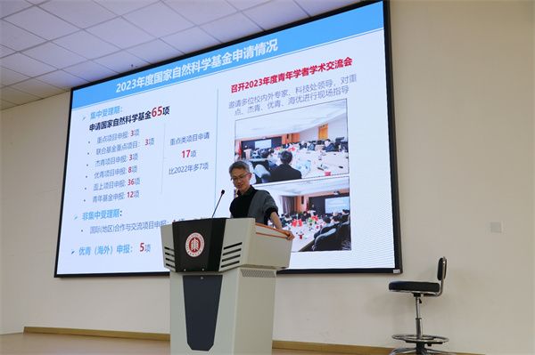 受学院副院长武海斌委托,胡炳文随后通报近期学院科研工作进展,对2023年度国家自然科学基金申请情况、科技奖励申报情况、其他科研项目申报和获批情况进行分析;并对理工类科研项目统一办理财务结账相关工作进行提醒,对征集2024-2025年度理工科基本科研业务费储备项目做进一步说明,最后通报了理工类实体科研单位基础绩效、优秀绩效及指标体系数据测算情况。