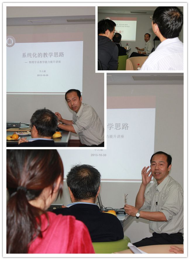继毕老师之后,华东师范大学物理学系的管曙光老师为大家做了题为“如何通过提问和课堂讨论引导学生思维”的讲座。管老师曾在清华大学、新加坡国立大学任教,在课堂组织方面有着丰富的经验。管老师先向大家展示了他在自己所执教的光学课程中批改作业发现问题从而与学生互动的情况,并指出老师对于一门课程的讲解要做到四个方面。首先,对于一门课程老师要讲出自己的理解,要能体现物理的“理”字。其次,在知识体系上,老师应该给出全局的观念,而不应该只局限于本门课程中的内容,还要帮助学生开阔眼界,完善知识体系。第三,老师与学生应该有良好的互动,这可以通过作业批改并写评语、习题课让学生来讲解习题得到体现,另外,在课堂上,如果可以以点学生名字提问的方式进行,学生也会感到亲切并且自己得到了重视,课堂气氛也会活跃起来。第四,是老师对工作的态度,如果课堂形式单一,那整个课堂就是在“闷”的气氛中进行;而如果老师可以恰当地进行提问,组织教学,“让学生的思维跟着你的思维跳舞”,这样的课堂是学生喜爱的。