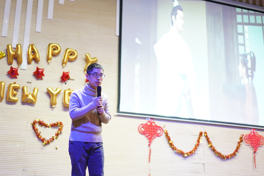 在热烈的掌声中,四位主持人上台,邀请院长程亚老师做新年致辞,他对全院师生过去一年的辛勤付出表示感谢,祝愿学院新的一年取得更大的成绩。